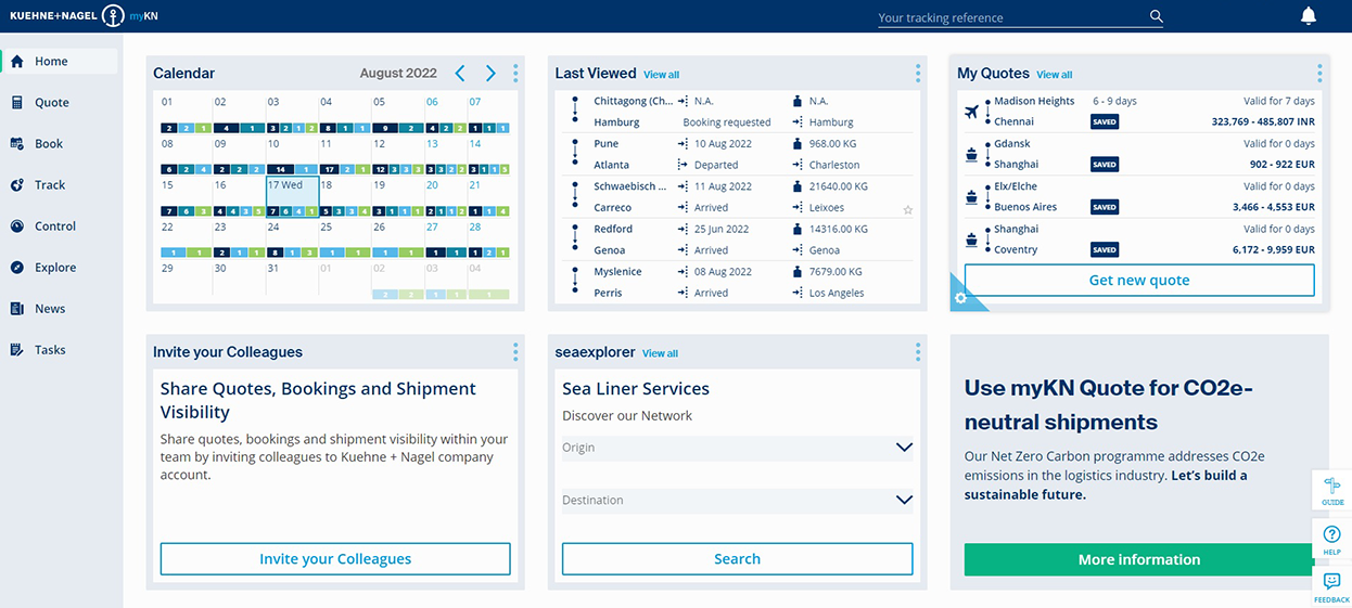 Το myKN είναι μια διαισθητική πλατφόρμα που σας παρέχει έναν γρήγορο και αξιόπιστο τρόπο εφοδιαστικής διαχείρισης. Λάβετε ανταγωνιστικές προσφορές για τις μεταφορές σας, πραγματοποιήστε άμεσα κρατήσεις και εντοπίστε τις αποστολές σας από οποιαδήποτε συσκευή.