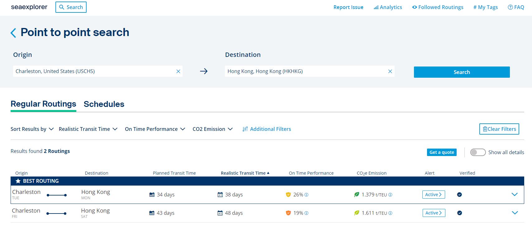 Διατηρήστε το προβάδισμα στον προγραμματισμό της εφοδιαστικής σας αλυσίδας χάρη στο seaexplorer, την έξυπνη πλατφόρμα της εταιρείας μας για υπηρεσίες θαλάσσιας μεταφοράς εμπορευμάτων. Με το seaexplorer αποκτάτε τη διαφάνεια που χρειάζεστε για να επιλέγετε την βέλτιστη εναλλακτική δρομολόγησης των αποστολών σας.