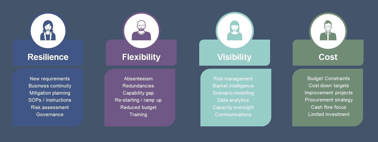 - Resources: As economies recover, your goal is to restart and ramp up production. This can be limited by constrained capacity, capability gaps and a lack of appropriate resources.